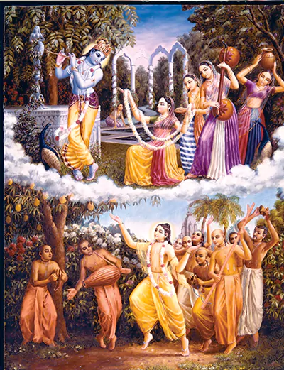 கிருஷ்ணரின் கையில் எப்போதும் குழலும் கொம்பும் இருக்கின்றன; அவருடன் இருப்பவர்கள், அவரது இன்பத்திற்காக, பல்வேறு இசைக் கருவிகளை வாசிக்கின்றனர். அவர்கள் அனைவரும் எப்போதும் ஆடிப்பாடி மகிழ்கின்றனர். விஷ்ணுவின் கையில் எப்போதும் சங்கு இருக்கிறது; வைகுண்டவாசிகள் பல்வேறு இசைக் கருவிகளை வாசித்து, பகவானின் பெருமைகளைப் பாடி ஆடுகின்றனர். ஆன்மீக உலகில் ஒவ்வோர் அசைவும் நடனமே; ஒவ்வொரு பேச்சும் பாடலே. ஆடலும் பாடலும் அந்த உலகின் இயல்பான தன்மைகள். (பிரம்ம சம்ஹிதை 5.56)